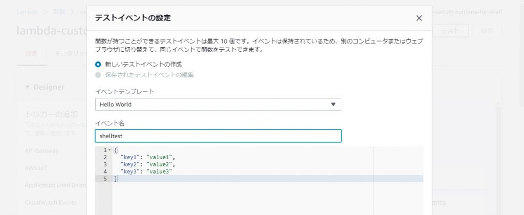 テストイベントによって渡されたJSONデータをシェルが受け取って出力(echo)する ということが実現できていますね。