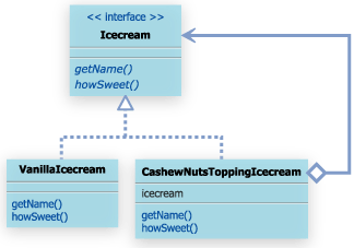 Icecream ice1 = new CashewNutsToppingIcecream(new VanillaIcecream()); Icecream ice2 = new CashewNutsToppingIcecream(new GreenTeaIcecream()); Icecream ice3 = new SliceAlmondToppingIcecream(new CashewNutsToppingIcecream(new VanillaIcecream()));