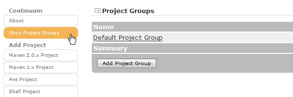 Continuum で扱う一番大きな単位はプロジェクトグループです。左メニューの「Show Project Groups」をクリックするとプロジェクトグループ一覧画面が表示されます。インストール直後では「Default Project Group」という名前のプロジェクトグループが作成されています。